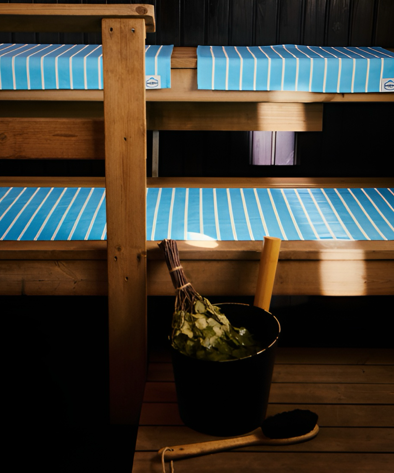 Turkos- och vitrandig bastuhandduk. Tillverkad av 100 % bomull, vävd och garnfärgad för hållbar kvalitet. Mjuk mot huden och torkar snabbt – passar både hemma och i strandbastun.